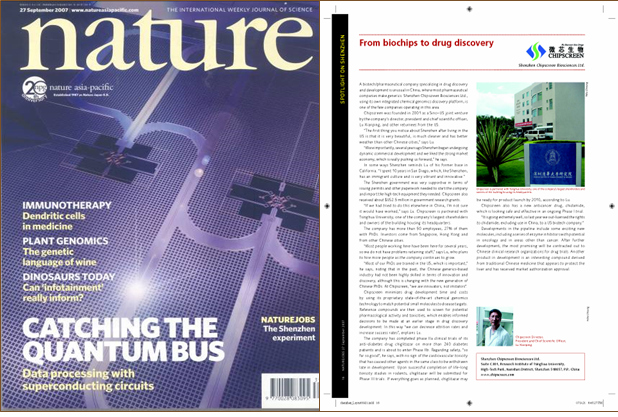 2007年9月27日NATURE杂志籍第九届中国国际高新技术成果交易会在深圳召开之际,以“聚焦深圳”为主旨,对深圳“从小渔村到高科技发动机,一座永不停步的城市”做了全面而深入的报道。其中,以“从生物芯片到药物探索”为题,专题报道了庄闲ag生物科技有限责任公司。